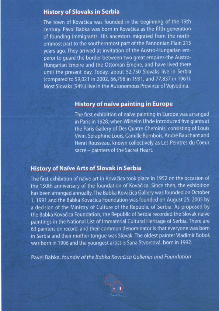 Na pozivnici za svečano otvaranje izložbe, ispisani su kratki istorijati Slovaka u Srbiji i njihovog naivnog slikarstva. Na spisku Nacionalnog registra srpskog kulturnog nasleđa nalaze se 62 slovačka slikara, najstariji Vladimir Boboš rođen je 1906. godine, dok je najmlađa Sanja Stvorcova 1992. godište. Galeriju „Babka", koja okuplja slikare naive, osnovao je Pavel Babka u Kovačici.