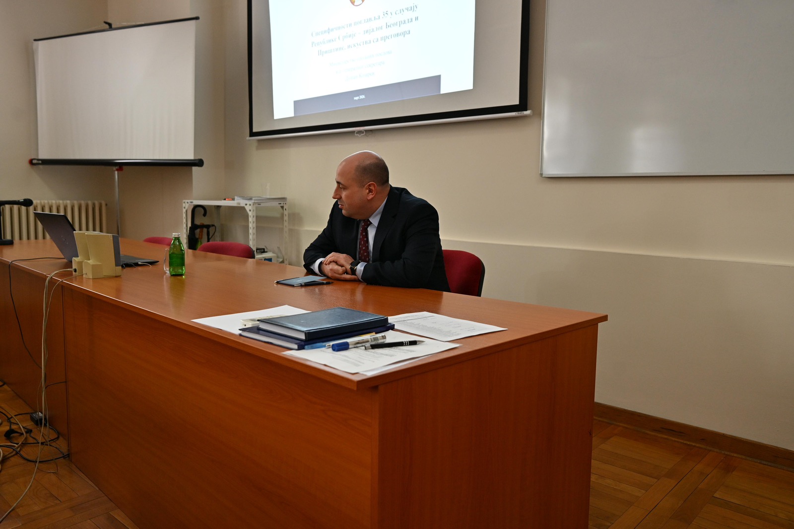 Posebno se osvrnuo na specifičnosti mehanizma za praćenje sprovođenja postignutih dogovora u okviru dijaloga Beograda i Prištine, imajući u vidu svoje dugogodišnje radno iskustvo u Kancelariji za Kosovo i Metohiju, a posebno kao člana pregovaračkog tima i sekretara Pregovaračke grupe za poglavlje 35 u pregovorima o članstvu Srbije u Evropskoj uniji.