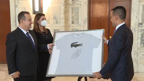 Šef srpske diplomatije poklonio je italijanskom kolegi majicu i tenisku lopticu sa potpisom srpskog tenisera Novaka Đokovića naglasivši da je to specijalno za njega.