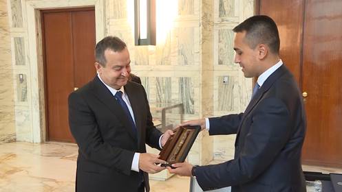Prvi potpredsednik Vlade i ministar spoljnih poslova Republike Srbije Ivica Dačić i ministar za spoljne poslove i međunarodnu saradnju Italije Luiđi Di Majo razmenili su danas poklone posle sastanka u Rimu gde Dačić boravi u jednodnevnoj poseti.