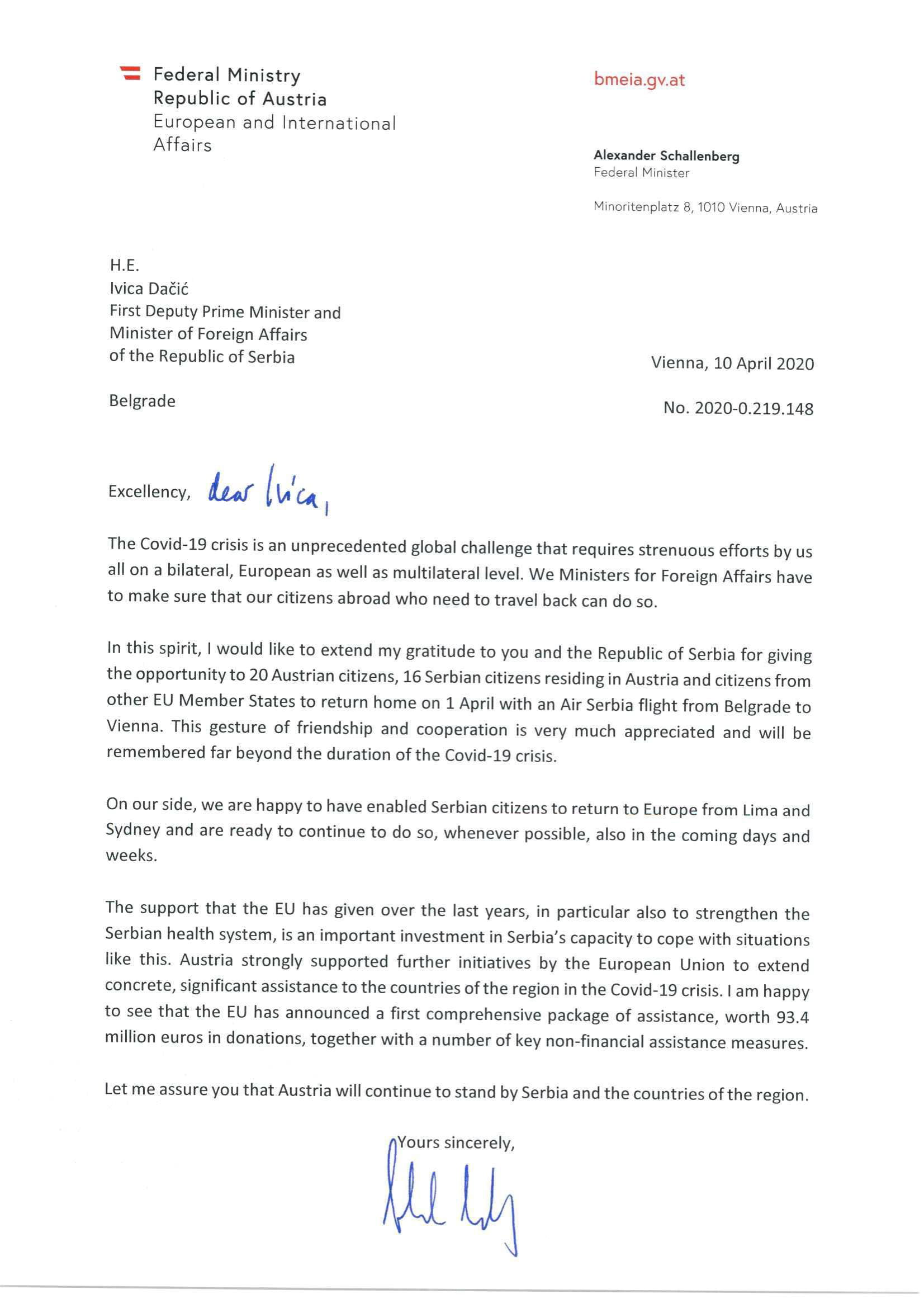 U ovom smislu želeo bih da izrazim zahvalnost Vama i Republici Srbiji što ste omogućili grupi od 20 državljana Austrije, 16 državljana Srbije koji žive u Austriji i državljanima iz drugih članica Evropske unije da se vrate svojim kućama 1. aprila letom Er Srbije iz Beograda za Beč. Visoko cenimo ovaj gest prijateljstva i saradnje i pamtićemo ga dugo nakon završetka krize izazvane COVID-19.