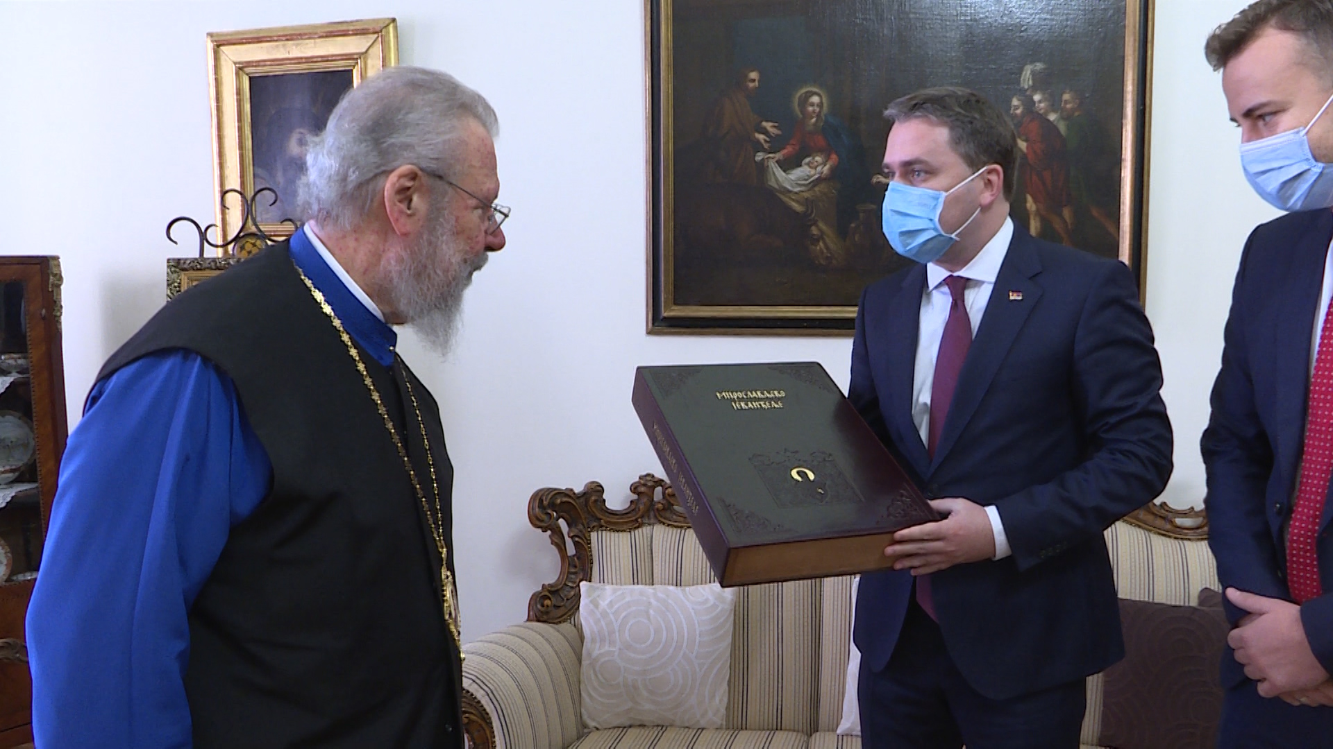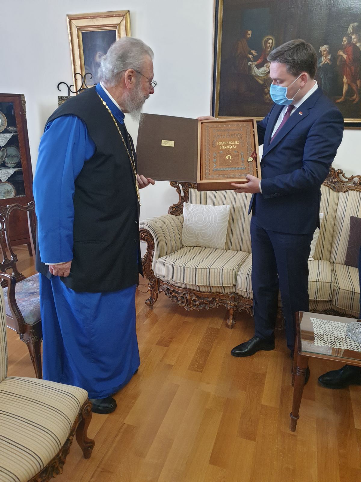 Састанак је одржан у Архиепископији у Никозији, где је шеф српске дипломатије поклонио Хризостому фототипско издање Мирослављевог јеванђеља, најстарије српске ћириличне књиге написане у последњој четвртини 12. века.